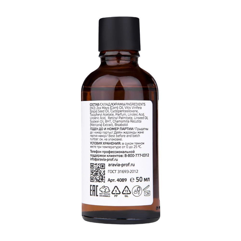 Состав продукта (INCI): Zea Mays (Corn) Oil, Vitis Vinifera (Grape) Seed Oil, Cyclopentasiloxane,Tocopheryl Acetate,Parfum, Linoleic Acid, Linolenic Асid, Rеtinyl Раlmitate, Linseed Oil, Soybean Oil, BHT, Chamomilla Recutita (Matricaria) Extract, Bisabolol.