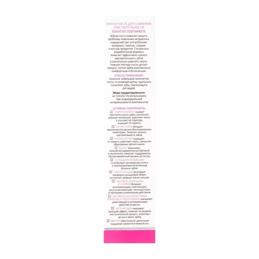 Зубная паста помогает решить проблему появления неприятных ощущений при употреблении холодных, горячих, сладких и кислых продуктов. Специально разработанная формула помогает эффективно снизить чувствительность зубов и значительно укрепить эмаль. Нежная текстура пасты делает процесс чистки зубов максимально комфортным и безопасным.